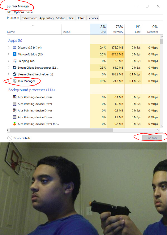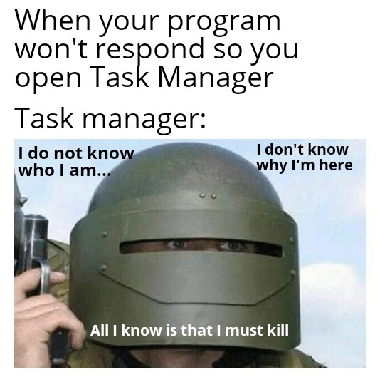 45+ Task Manager Meme Antivirus. Scan individual files, exclude files, . See more 'screenshots of despair' images on know your meme! Find and save task manager memes | from instagram, facebook, tumblr, twitter & more. Immunet® is a malware and antivirus protection system that utilizes cloud computing. If you are experiencing a ransomware attack, follow these three steps to identify and stop a potential ransomware program running on your . May be a meme of one or more people and text that says 'task manager. Revert to windows 7 and buy decent internet security and antivirus. See, rate and share the best task manager memes, gifs and funny pics. In case someone didnt know, task manager has a start up tab that will tell you the impact some programs have on the boot up process. Make your own images with our meme generator or animated gif maker.
